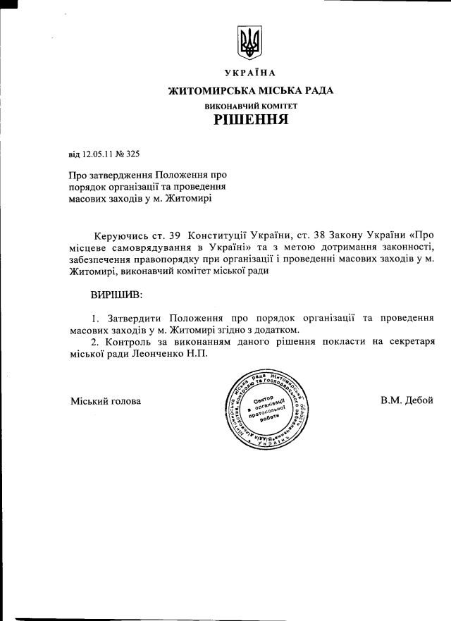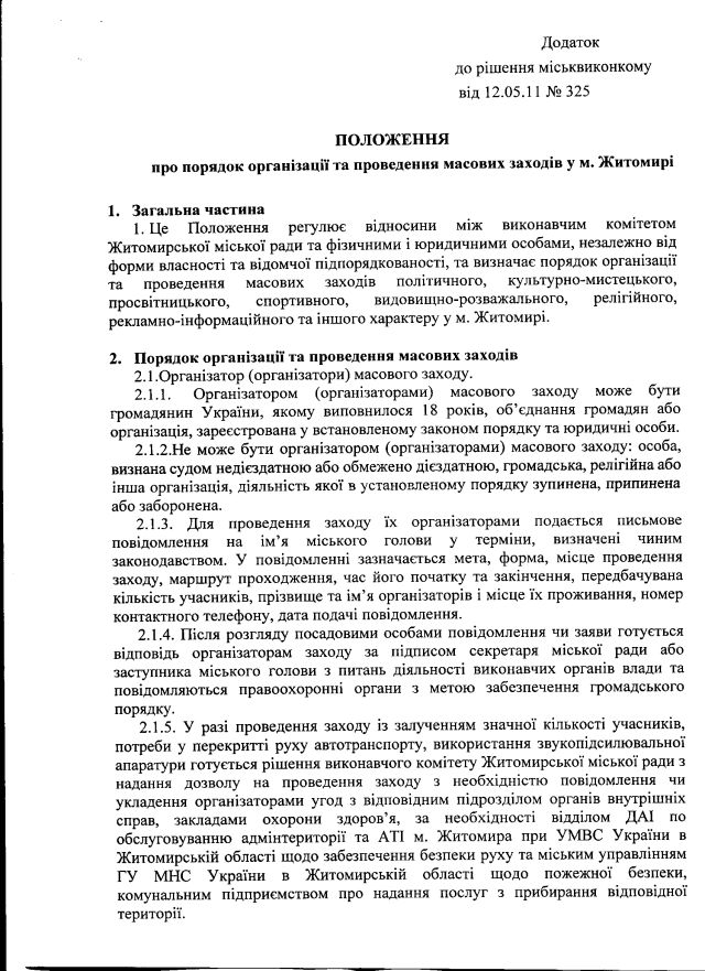 1. Чи існує затверджений міською радою порядок розгляду повідомлень громадян, громадських організацій, політичних партій про проведення мирних зборів, мітингів, демонстрацій та інших масових заходів (ст.39 Конституції України)? Якщо так – надати копію такого акту. Якщо ні – надати інформацію, чим конкретно (якими правилами і критеріями) керується міська влада при визначенні наявности підстав для звернення до суду щодо обмеження права на мирні збори.