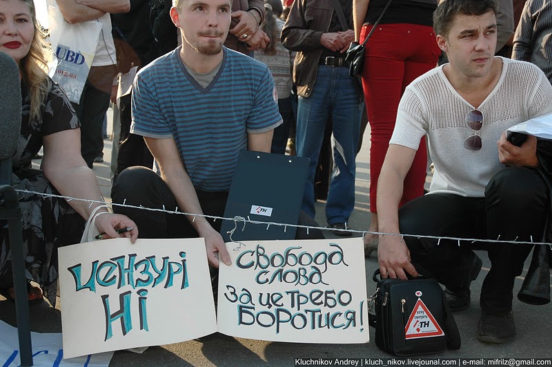 Когда журналистам затыкают рот, зрителям завязывают глаза. Харьковская молодежь сегодня вышла на площадь Свободы защитить свободу слова и добиться восстановления эфира трех харьковских телекомпаний – АТН, «Форы» и «А/ТВК». Что именно произойдет со зрителями, если у них не будет права самим выбирать информацию, инициаторы акции продемонстрировали на себе
