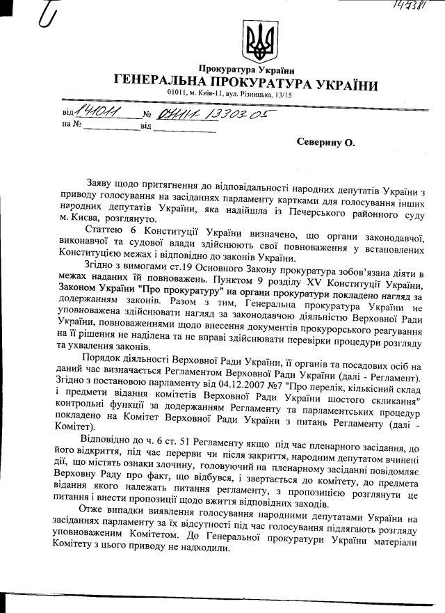 29.03.11 до Генеральної прокуратури України було надіслано заяву про злочин – голосування невідомими особами картками відсутніх народних депутатів – на порушення частини третьої ст.84 Конституції України, рішення КСУ №11-рп від 07.07.98, у чому є ознаки злочинів, передбачених ст.344 (“втручання у діяльність державного діяча”) та/чи ст.351 (“перешкоджання діяльности народного депутата України та депутата місцевої ради”) Кримінального кодексу України.