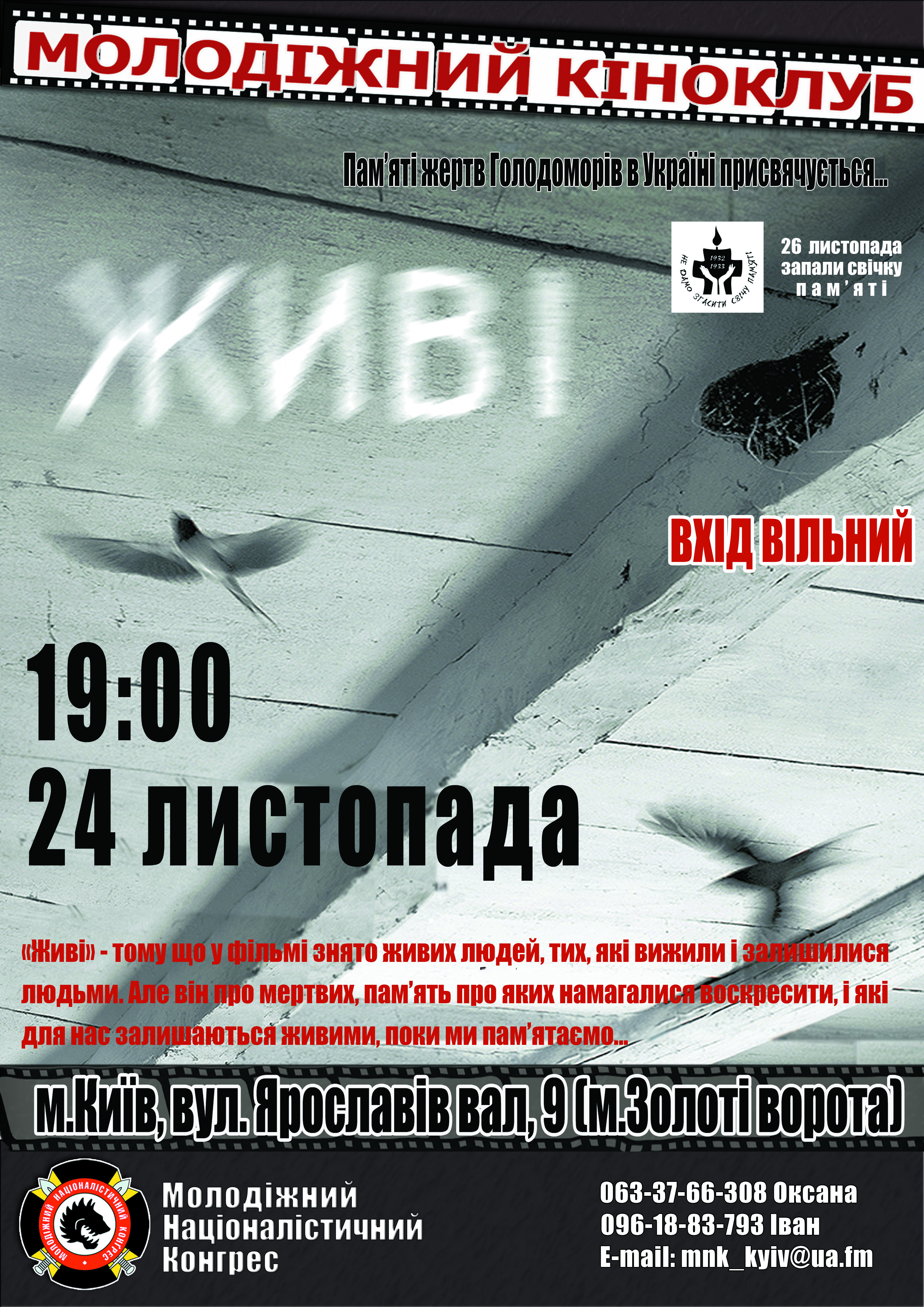 24 листопада в молодіжному кіноклубі МНК відбудеться показ фільму «Живі». Захід присвячений Дню пам’яті жертв Голодомору та політичних репресій.