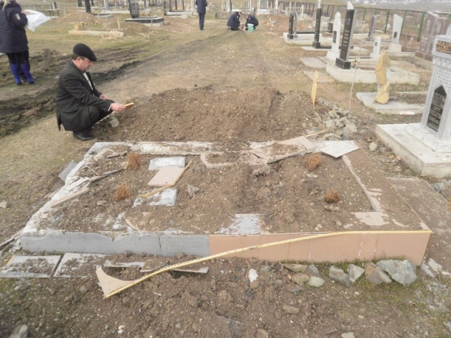 Варвары проехались на машинах по свежим могилам, неоднократно пытались сломать надгробные плиты…. и добились своей цели. На фотографии – мужчина, который совсем недавно похоронил свою мать, её свежая могила оказалась под колесами машин