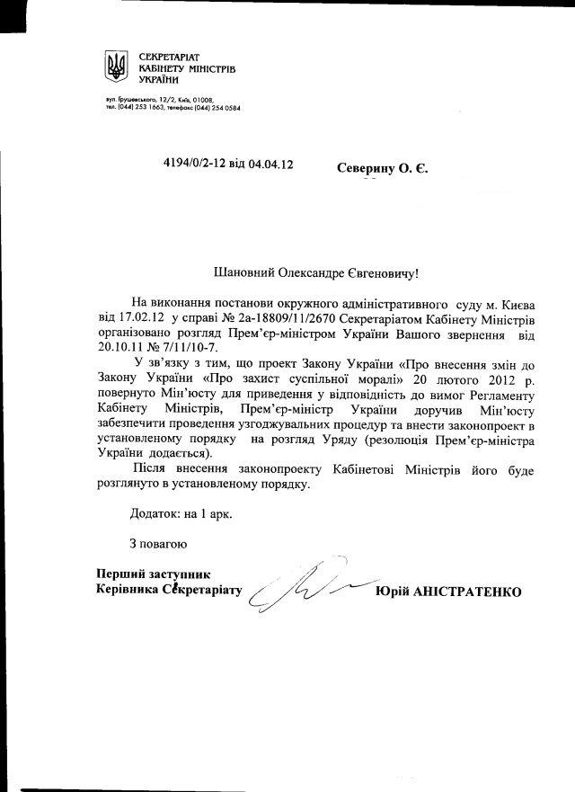 Як повідомляв “Майдан”, Секретаріат Кабінету Міністрів України програв суд про визнання протиправною дією відфутболювання звернення до М.Азарова щодо причин гальмування виконання доручення Януковича щодо “вирішення питання про ліквідацію Національної експернтої комісії з питань захисту суспільної моралі”.