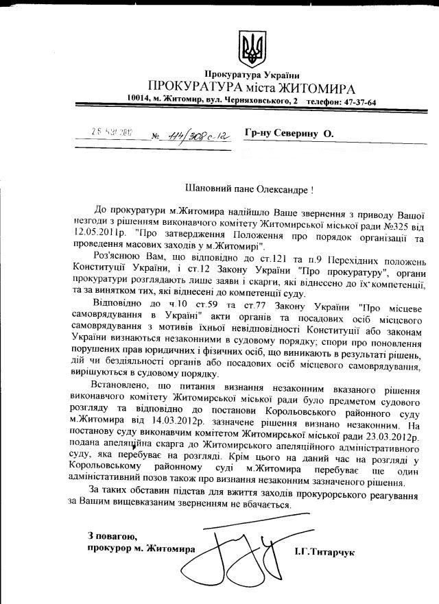 Першою відгукнулася прокуратура Житомира, принесши (власне – підтвердивши) благу звістку про те, що вже існує судове рішення про визнання “Положення про порядок організації та проведення масових заходів у м.Житомирі” незаконним. Амінь.