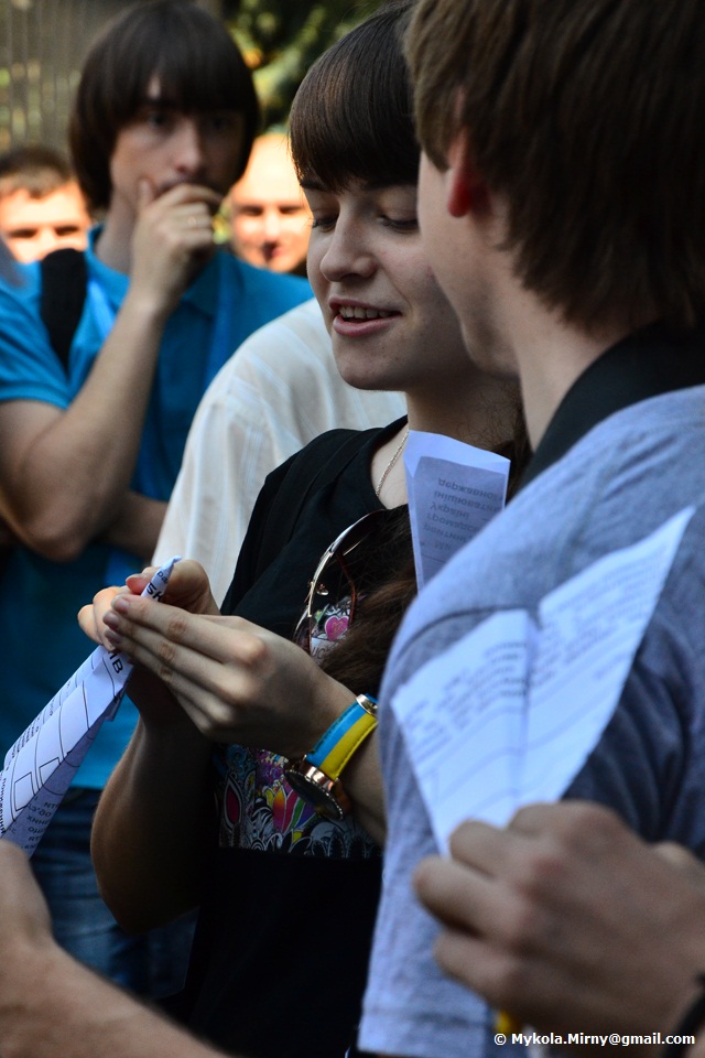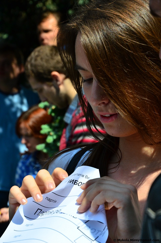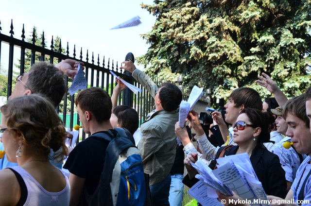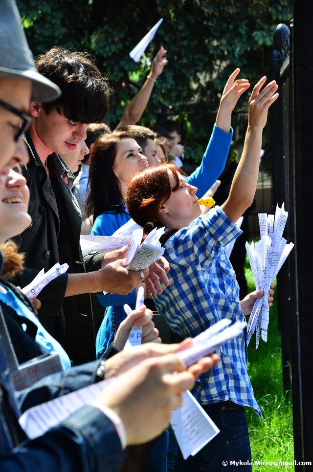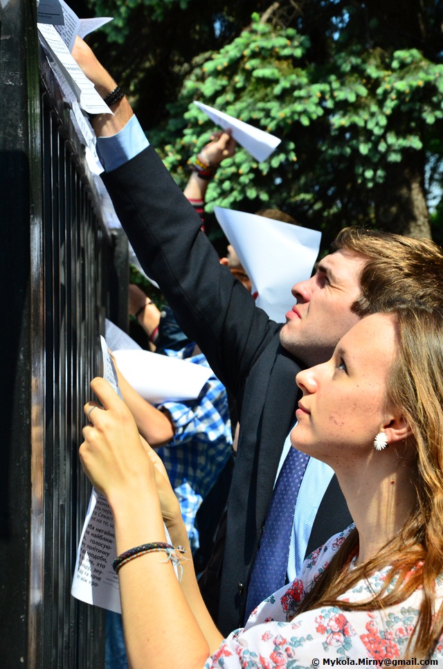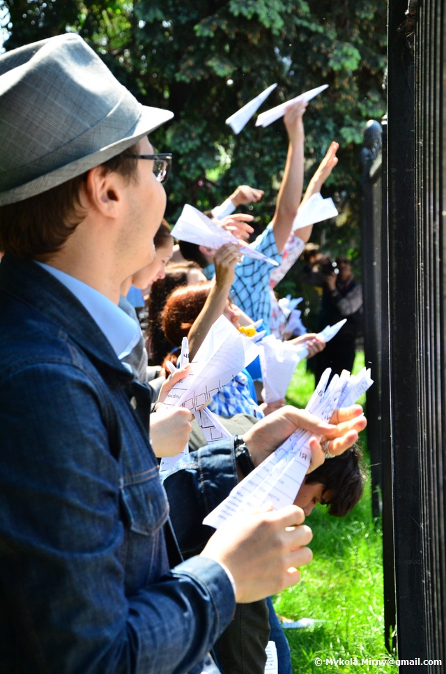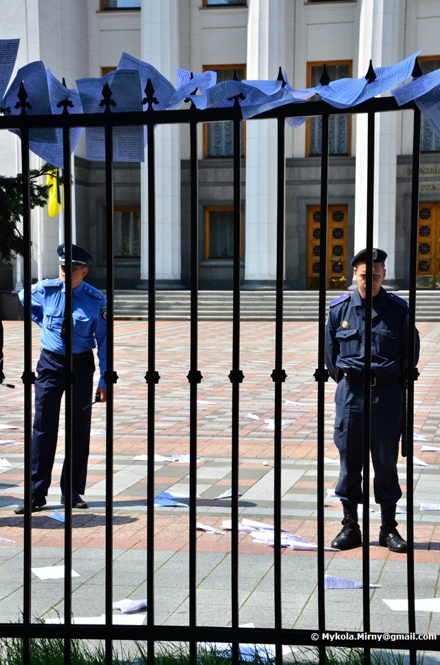 Студенти, опозиційні депутати, митці що вишукувавшись вздовж паркану Верховної ради, дули в свистки і запускали через паркан зроблені з виборчих бюлетенів літачки.