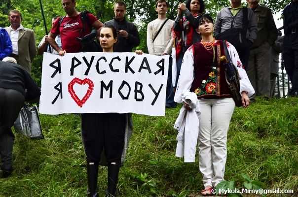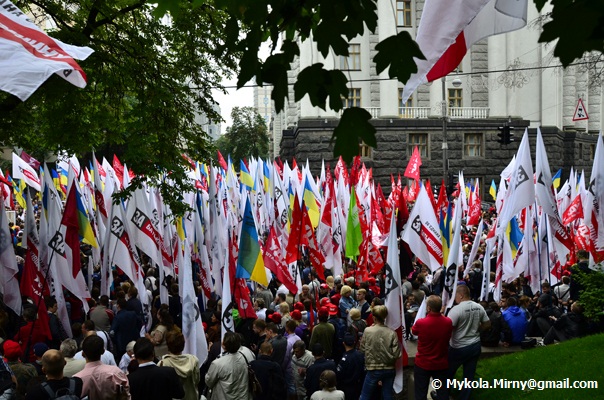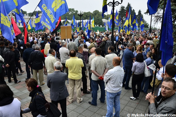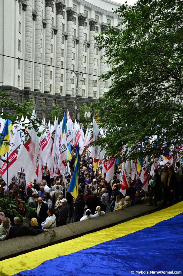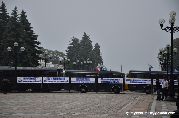 Захисники української мови не очіквали, що міліція дозволить білоблакитним активістам зайняти цілу вулицію від Кабміну до Маріїнського парку, тому їм довелось тіснитись на розі Садової під Кабміном із символікою Українського конгресу націоналістів, “За Батьківщину”, Удару та Свободи.