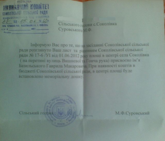 У селі Соколівка Жашківського району Черкаської області з’явилась площа імені Гаврила Базильського. Відповідне рішення ухвалили сільська рада.