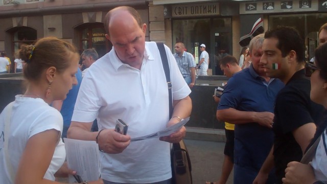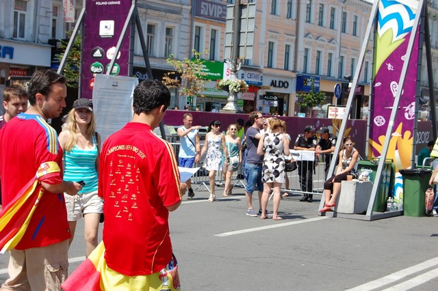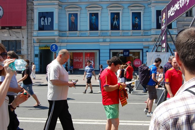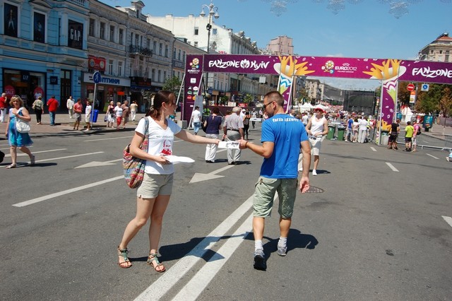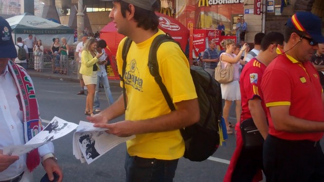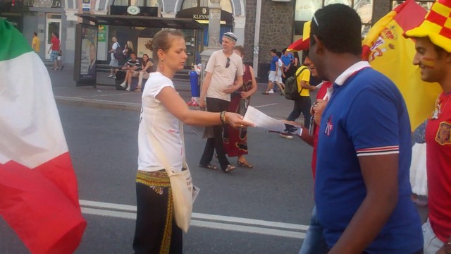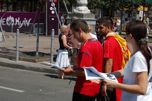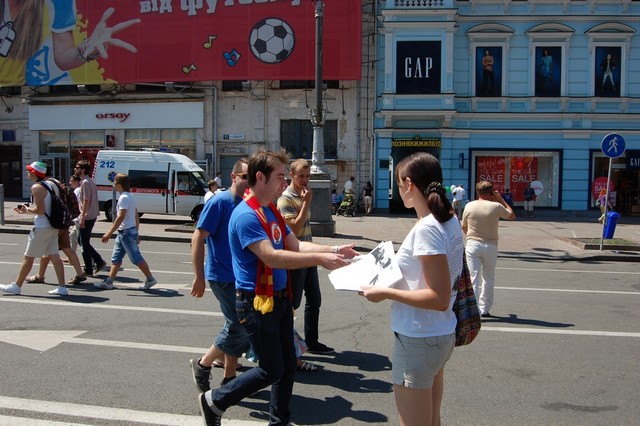 Вчора активісти Громадянського руху “Відсіч” проінформували іноземців, які приїхали до Києва на фінал чемпіонату Євро 2012, про заплановані по всій Україні акції протесту проти розкольницького законопроекту Ківалова-Колесніченка “Про засади державної мовної політики”. Гості столиці дізналися, що в той час, коли в Україні проходить маштабний європейський футбольний захід, українська влада має намір зупинити євроінтеграційні процеси в нашій державі, шляхом прийняття вибухонебезпечного мовного законопроекту, який загрожує розколоти країну і навіть може призвести до громадянської війни на кордонах Європейського Союзу.