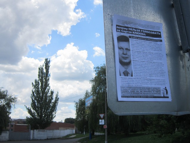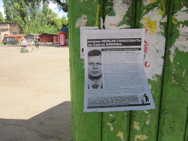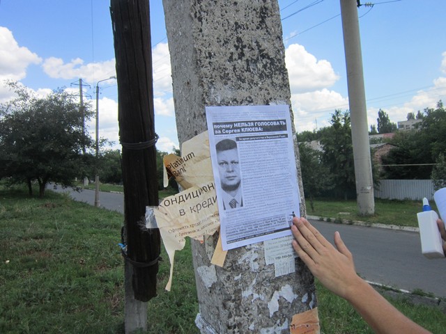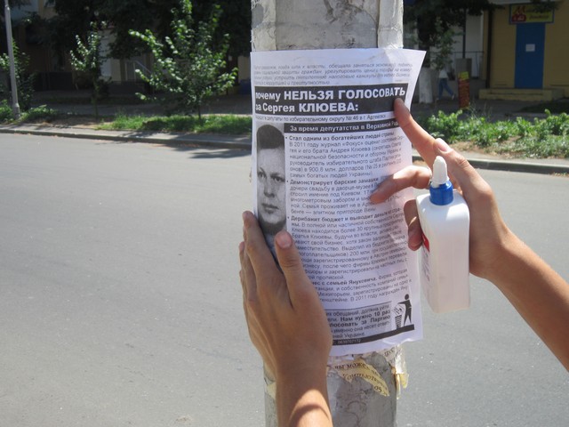 Мешканців міста Артемівська Донецької області активісти кампанії “Помста за розкол країни” закликали не голосувати за Сергія Клюєва, брата одного з головних тіньових лобістів законопроекту Колесніченка-Ківалова “Про засади державної мовної політики” голови Ради нацональної безпеки і оборони України та керівника виборчого штабу Партії регіонів Андрія Клюєва.