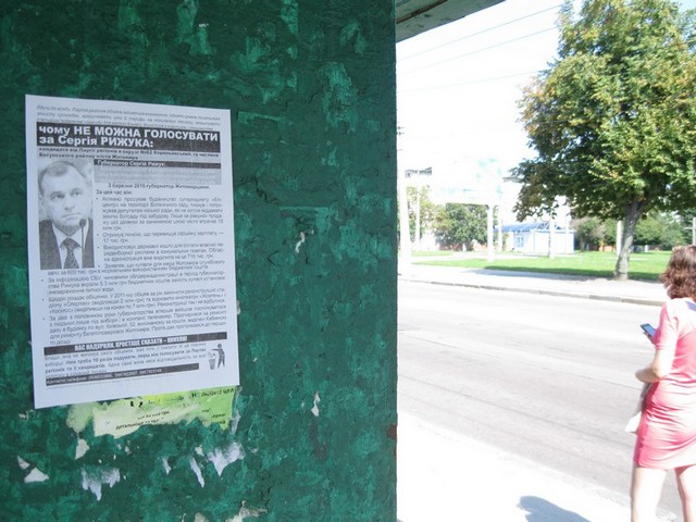 Цього разу місцеві активісти кампанії поширювали в Житомирі листівки в яких висвітлили “досягнення” Володимира Рижука за час його керівництва областю. Зокрема, житомирянам нагадали, що Сергій Рижук вже не перший рік перебуває в політиці і ще в 2005 році, під час роботи на посту міністра агрополітики, проти нього порушували кримінальну справу, а працюючи на посаді губернатора він був причетний до земельного дерибану та розкрадання бюджетних коштів.