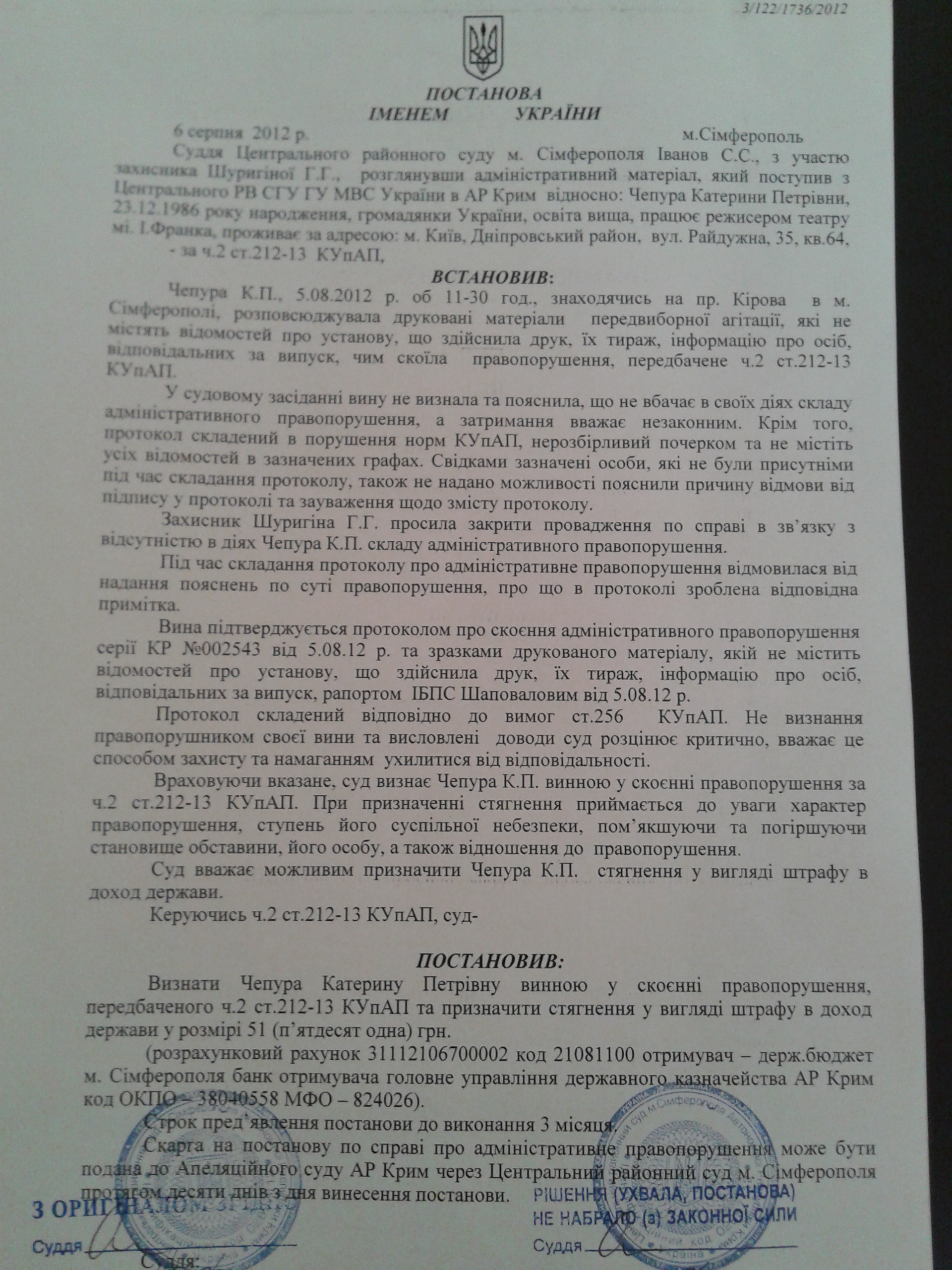 Суддя Центрального районного суду м. Сімферополя С. С. Іванов присудив активістам кампанії “Помста за розкол країни” Катерині Чепурі та Юрію Шивалі сплату 51 гривні штрафу за поширення листівок із закликами не голосувати на виборах за Партію регіонів та її місцевого кандидата-мажоритарника Віталіну Дзоз.