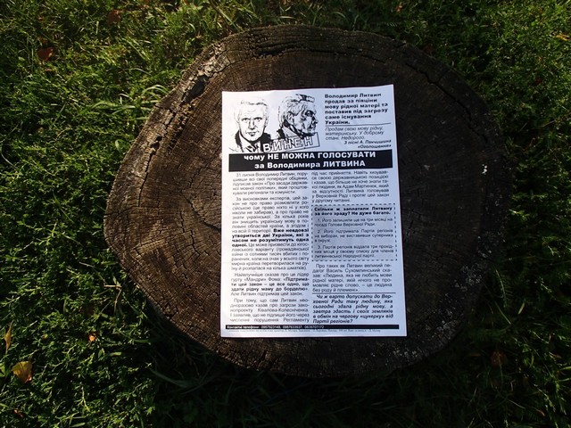 Також в ці вихідні, в рамках кампанії “Помста за розкол країни” відбулись поширення листівок проти Партії регіонів та її кандидатів в Житомирі – проти чинного губернатора Сергія Рижука, Дніпропетровську – проти Ігоря Циркіна та Харкові – проти Ірини Бережної.