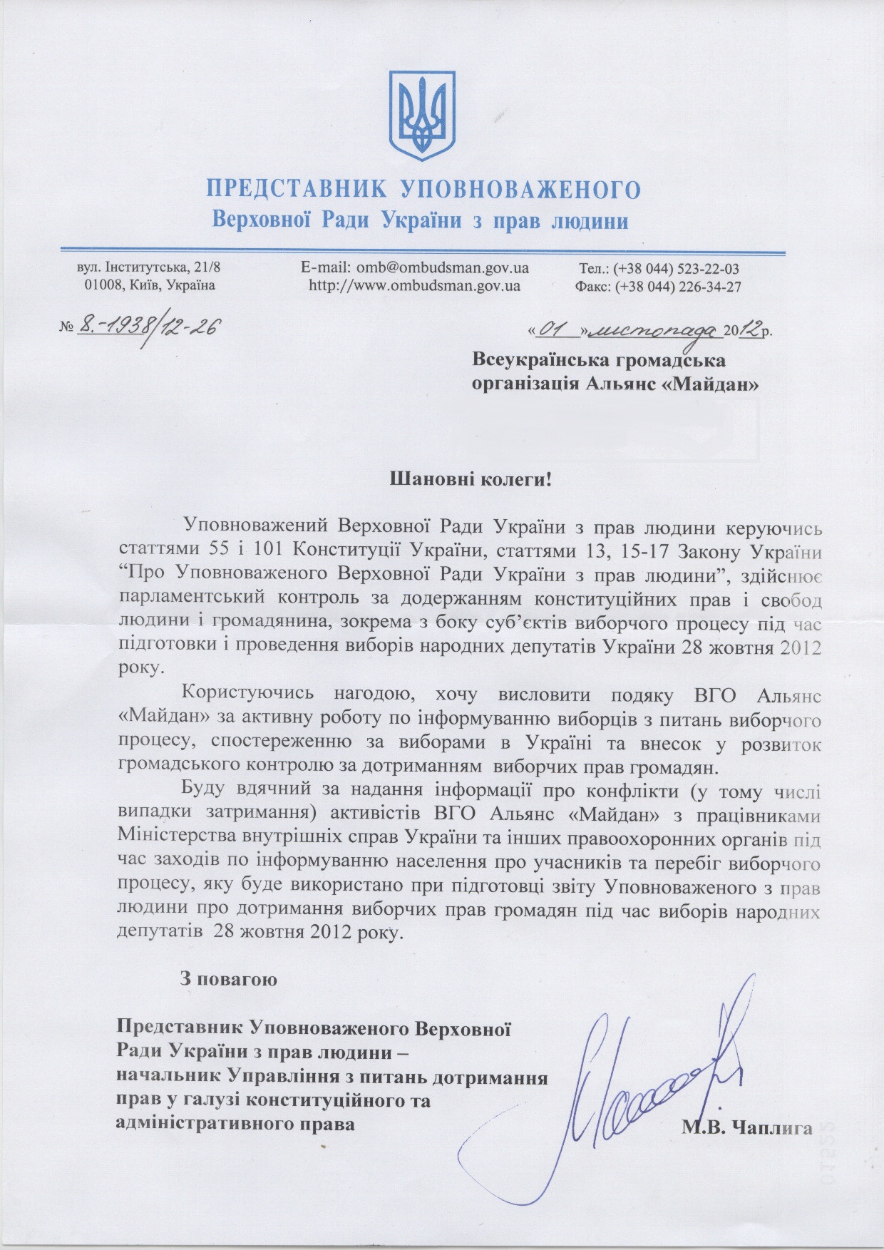 Сьогодні ми отримали від Секретаріату Уповноваженого Верховної Ради України з прав людини такого листа