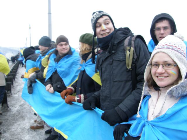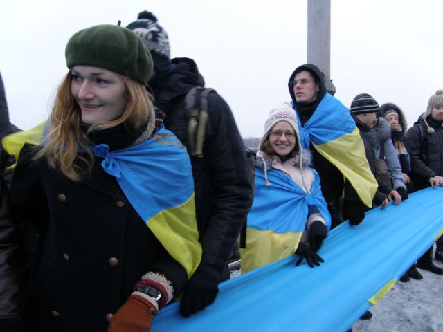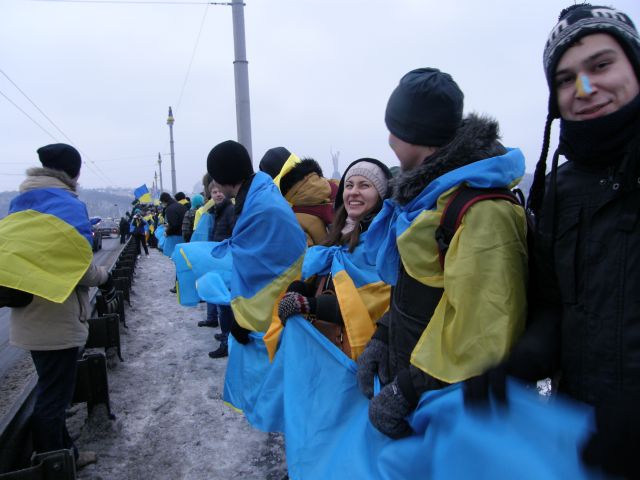 Київська молодь символічно з’єднала два береги Дніпра відзначаючи День Соборності України. Цього року акція розпочалася о восьмій ранку та зібрала кілька сотень молодих людей, що прямували один-до-одного з різних сторін мосту Патона. Зустрівшись посередині мосту учасники дійства взялися за руки утворюючи «живий» ланцюг, що символічно з’єднав лівий та правий береги Дніпра.