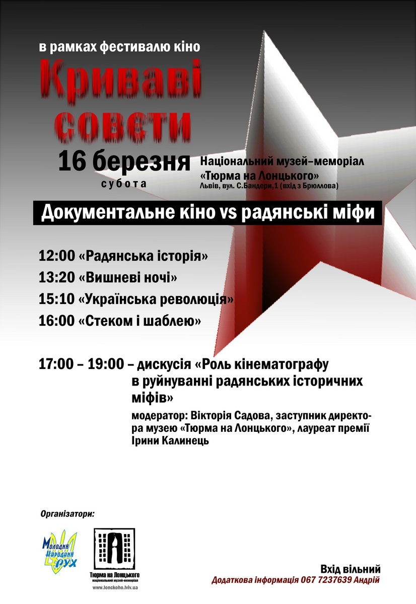 У Національному музеї-меморіалі «Тюрма на Лонцького» — дискусія «Роль кінематографу в руйнуванні радянських історичних міфів» та показ тематичної програми мандрівного фестивалю кіно «Криваві совєти», укладеної із стрічок, що розвінчують пропагандистські міфи СРСР та розкривають правду про злочини радянського окупаційного режиму.
