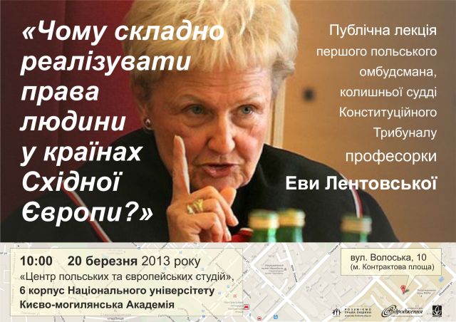 20 березня 2013 року у Києві відбудеться унікальна подія: людина, яка наприкінці восьмидесятих зробила революцію в сфері прав людини у Польщі – професорка Ева Лентовська – проведе у столиці публічну лекцію під час якої розповість про специфіку та складнощі реалізації прав людини у країнах Східної Європи.