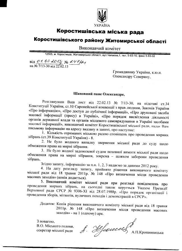 У Коростишіві на Житомирщині місцева влада, як з’ясував оце “Майдан Моніторинг” у процесі щорічного всеукраїнського дослідження свободи мирних зібрань в Україні, не лише вважає чинним нечинне – дохлий (бо неконституційний) совецький “указ”, але і власним рішенням, без законних на те повноважень, визначили єдине у місті місце проведення мирних зібрань – “нижню частину міського парку”.