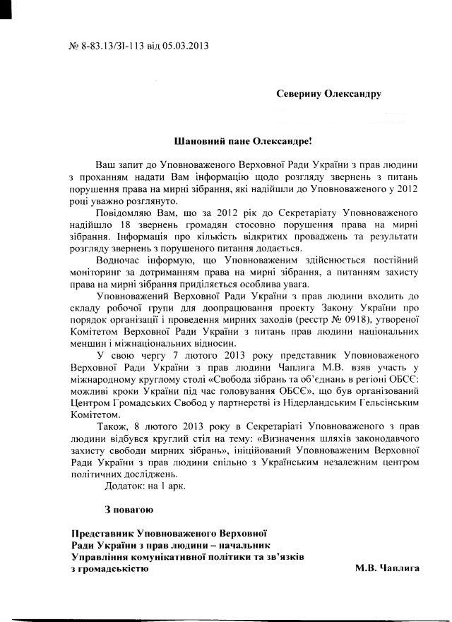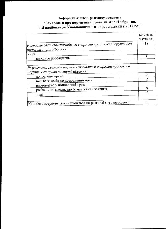Інформаційний центр “Майдан Моніторинг” у процесі щорічного дослідження свободи мирних зібрань в Україні спитав Уповноваженого Верховної Ради з прав людини про: кількість звернень громадян про захист порушеного права на мирні зібрання, кількість випадків порушення провадження, кількість відмов у порушенні провадження (за даними 2012 року). Відповідь – до вашої уваги: