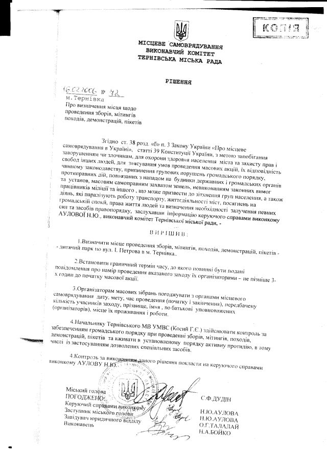 Нижче – відповідь виконавчого комітету Тернівської міської ради на запит “Майдан Моніторингу” про низку показників, що характеризують стан зі свободою мирних зібрань в Україні (аналогічні запити широко розіслано неосяжними іноді просторами батьківщини). Окрім того, що тернівські владці чомусь вважають чинним совецький указ 1988 року (до речі, цікаво б попитати, та часу нема, в якій це частині він “не суперечить Конституції”), вони також затвердили власний нормативний акт, яким:
