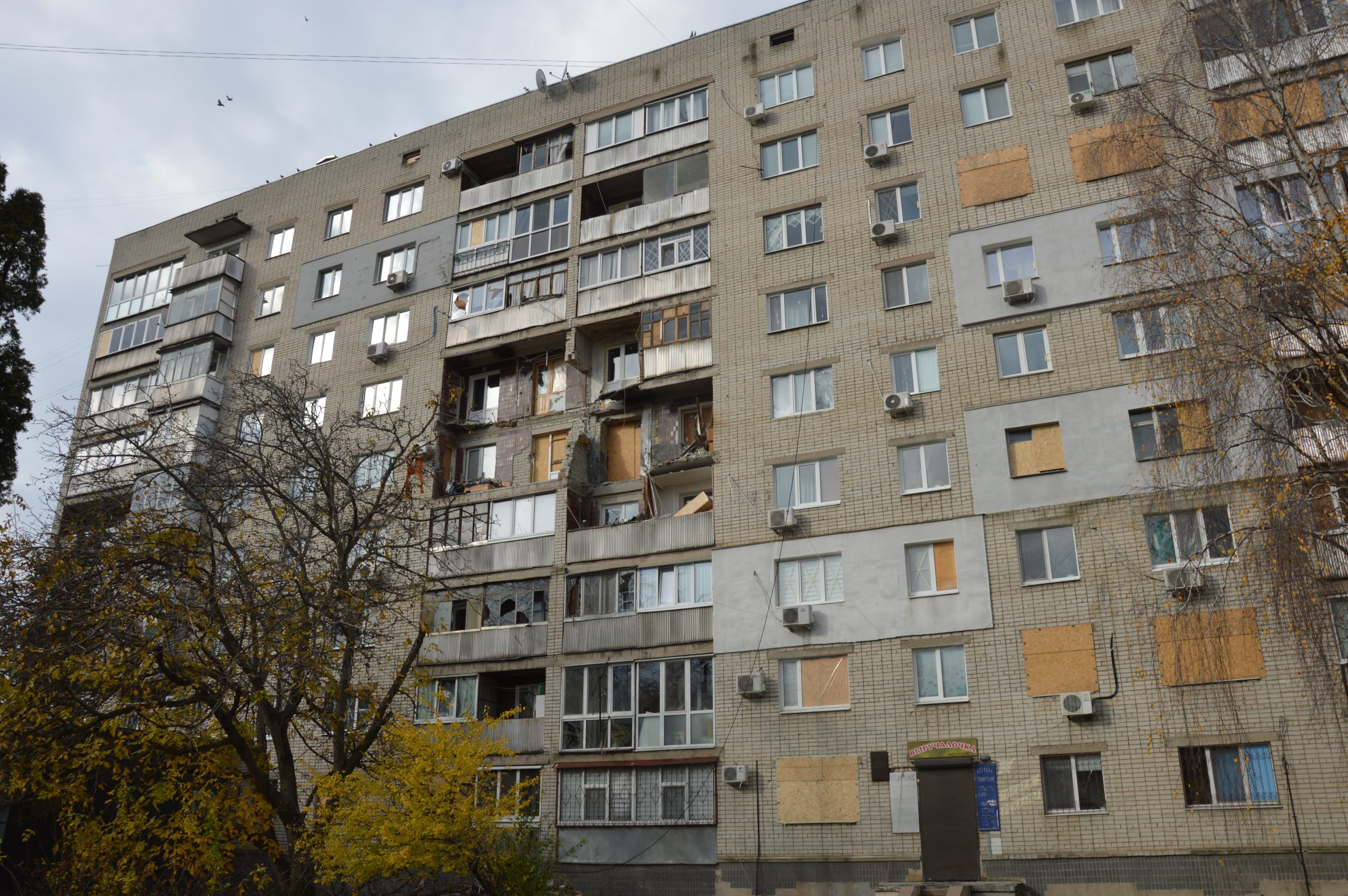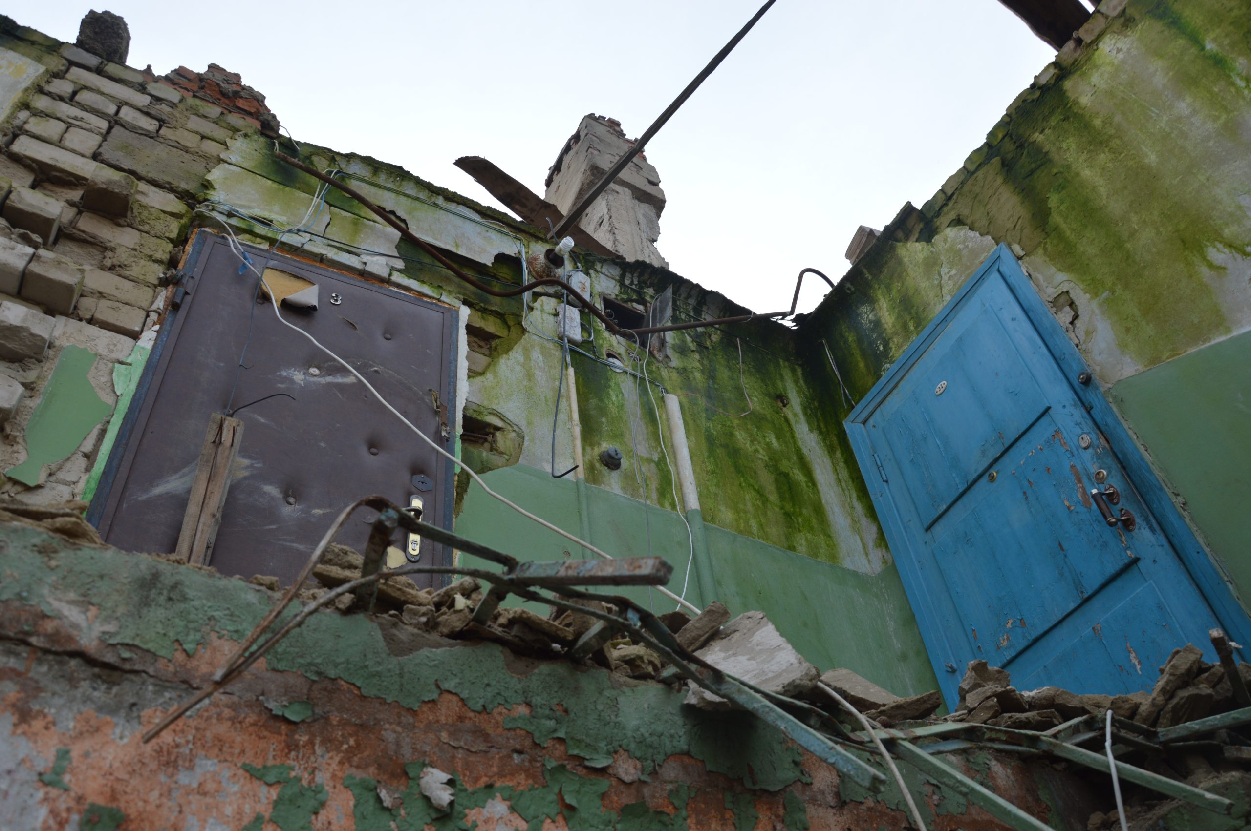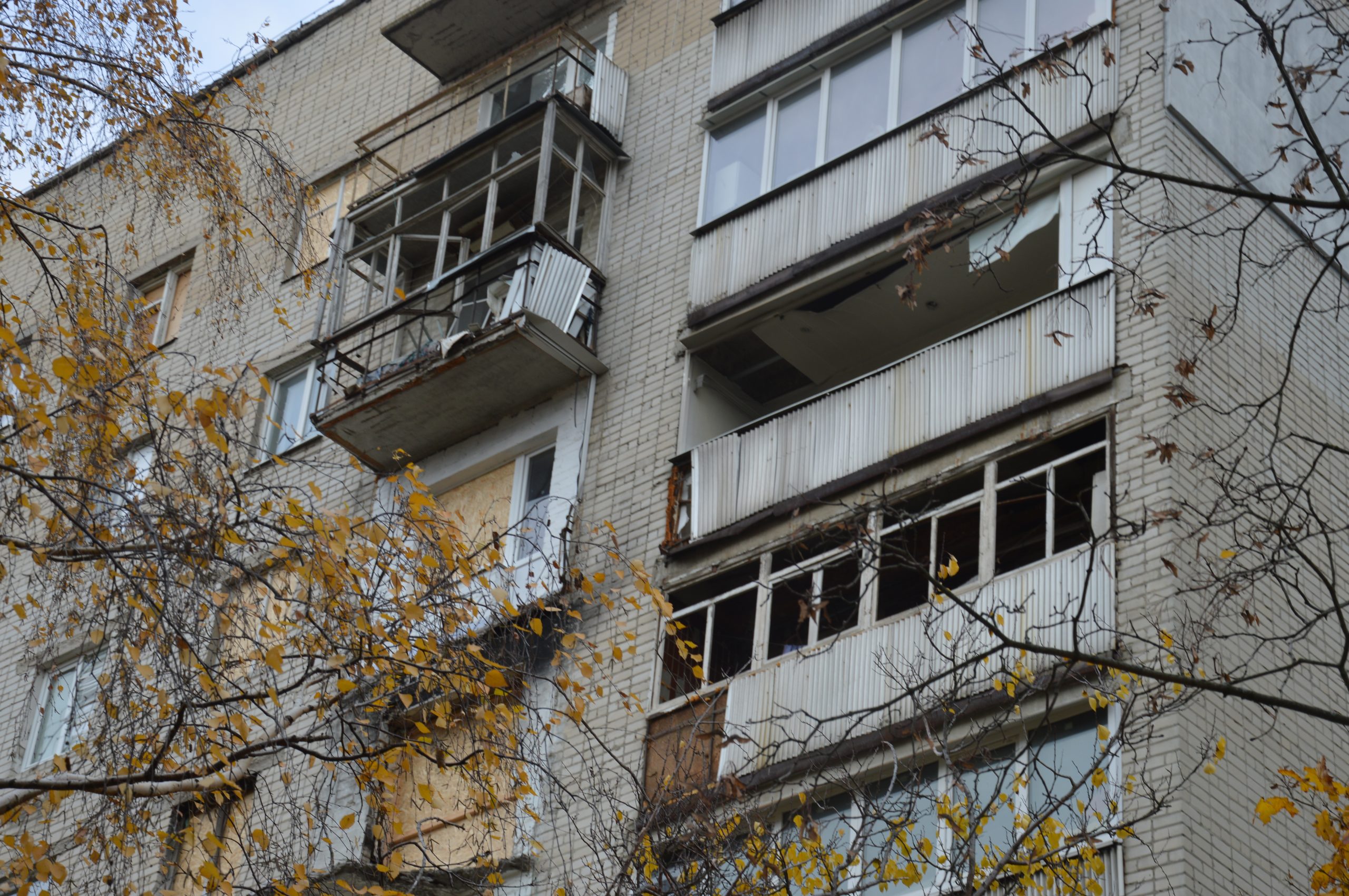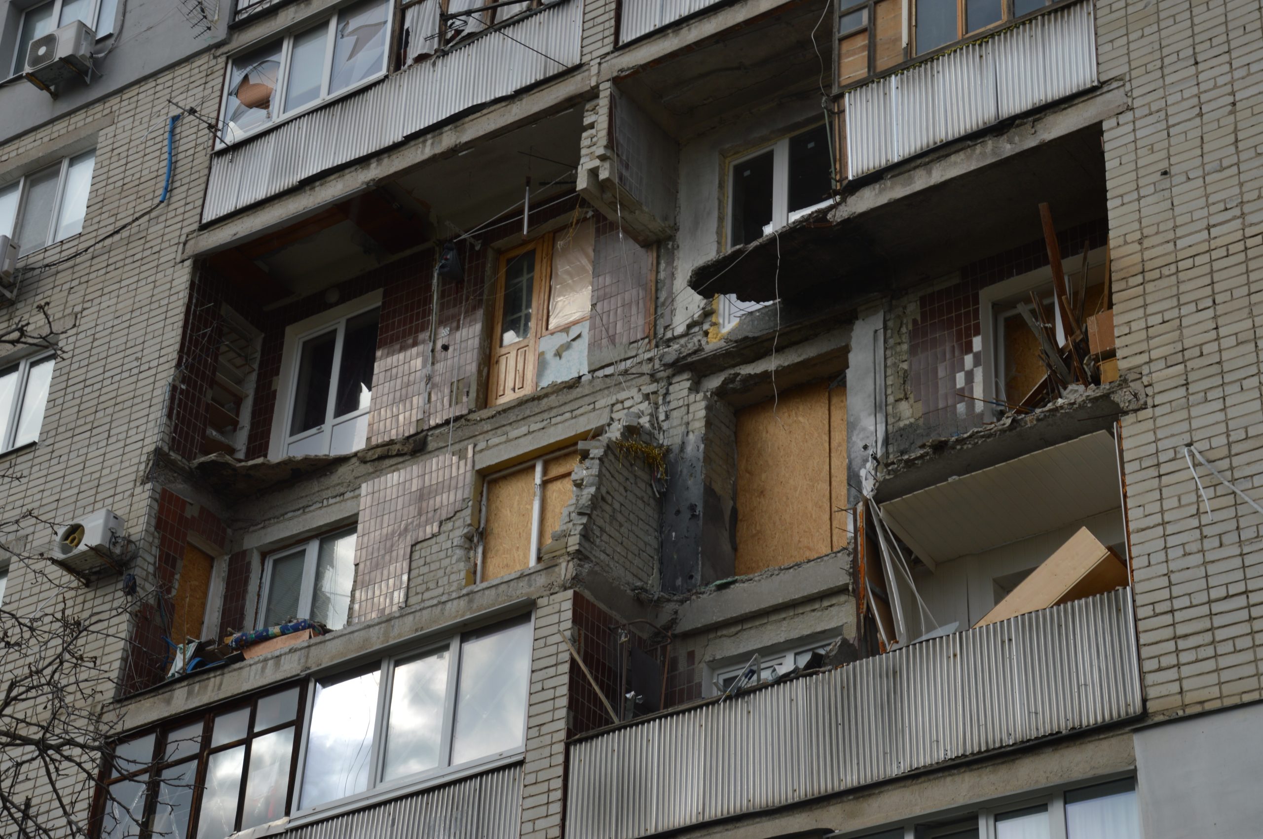 Від вибуху у квартирах зруйновані перекриття, і навіть легка вибухова хвиля може спричинити повне обвалення під’їзду. В цьому під’їзді живуть декілька людей, наражаючи себе на небезпеку.