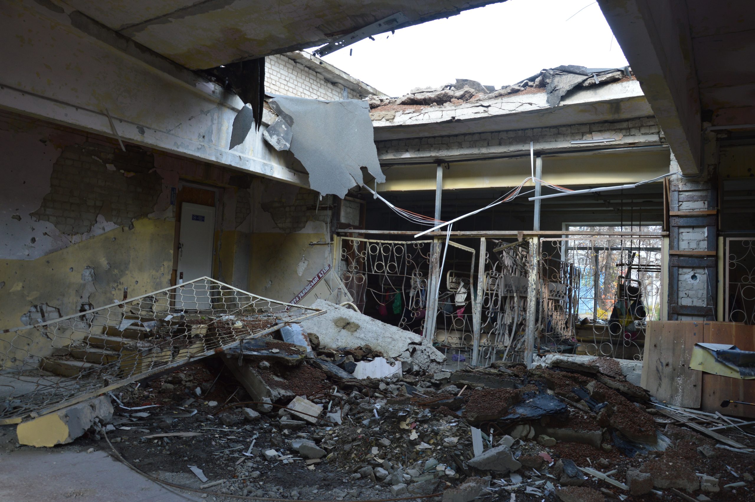 [Андрій та Наташа Тагаєви, волонтери ГО П’ятихатки-БАМ]: Школу також розбомбили. Масовані обстріли тут були, дуже сильні пошкодження будівлі, великі руйнації на третіх поверхах школи. За іронією долі, клас, в якому викладали російською мовою – якраз в цей клас зі всієї школи і прилетіло. Там навіть покрівля над ним провалена, вікон цілих практично не залишилося у школі, покрівля бита вся.