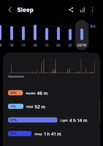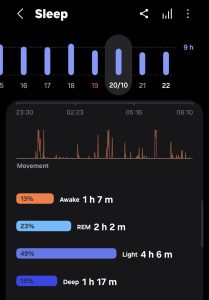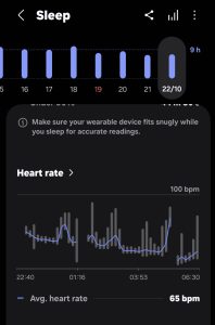 В мене є смарт годинник Samsung Smart Watch 4, який записує показники сну за допомогою програми Samsung Health. Там є графік пульсу уві сні, накладений на години. Це мій графік сну в ніч з 21 на 22 жовтня 2025 року.