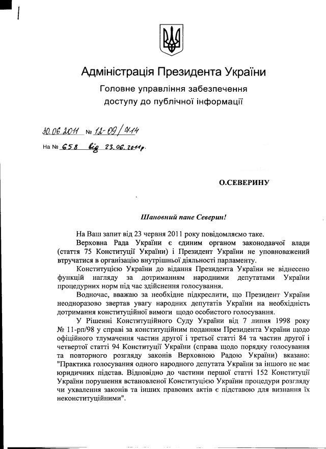 Як відомо, Конституція забороняє народним депутатам голосувати за інших. Як відомо, Президент є гарантом Конституції. От до нього ми і звернулися з питанням про те, як же він гарантує дотримання Конституції стосовно депутатів-піаністів. Текст звернення і скан відповіді дивіться нижче.