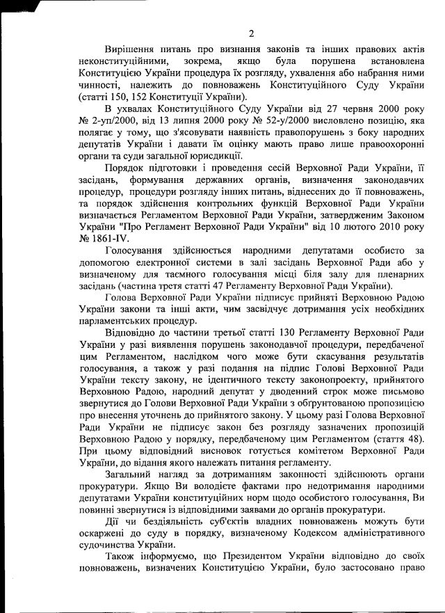 Враховуючи вищевикладене, просимо Вас як гаранта додержання Конституції України (частина друга ст.102) вжити відповідних заходів для відновлення правопорядку і законності в діяльності Верховної Ради України. Відповідь на це звернення просимо надати у встановлений законом строк на адресу