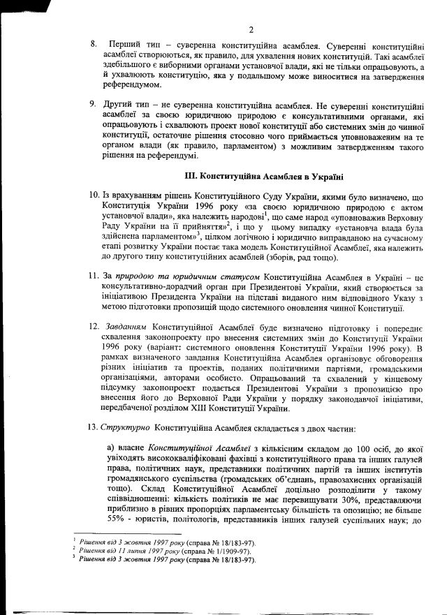 По-друге, класифікуючи відомі світу конституційні асамблеї на два типи – “суверенний” (створені для підготовки і безпосереднього ухвалення конституції) та “несуверенні” (створені в якости консультативних органів для розробки проекту конституції перед її затвердженням парламентом), Концепція рішучо обирає “несуверенність”, декларуючи: <ш>”За природою та юридичним статусом Конституційна Асамблея в Україні – це консультативно-дорадчий орган при Президентові України, який створюється за ініціативою Президента України на підставі виданого ним відповідного Указу з метою підготовки пропозицій щодо системного оновлення чинної Конституції”.