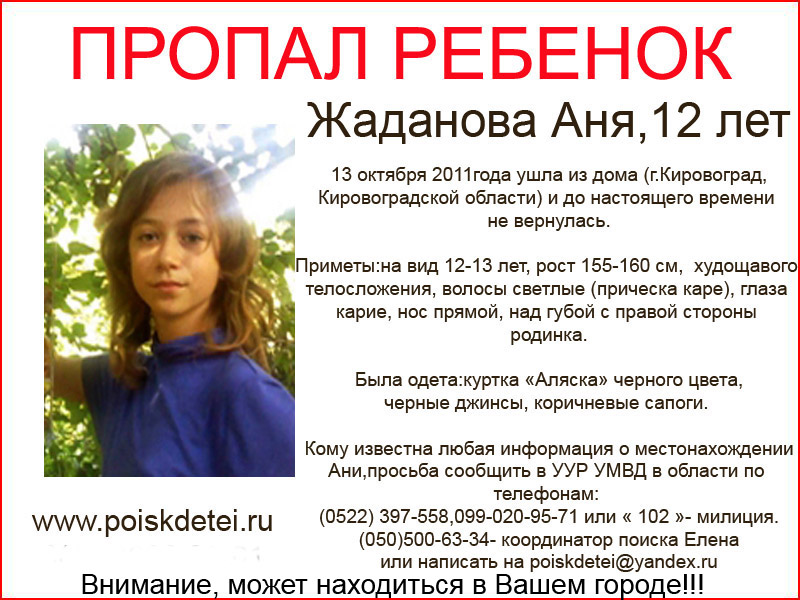 Допоможіть знайти дитину! Пропала 12-річна дівчинка 23-10-2011 23:39 kirovograd Language switcher Dansk DA Українська UK Deutsch DE Español ES Français FR Кіровоградщина