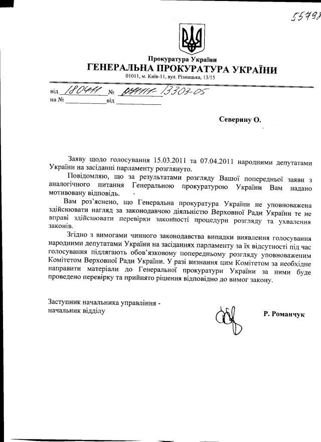 Проте листом від 06.04.11 заступника начальника управління Генпрокуратури п.Р.Романчука було явлено ще один варіант, процесуальним законодавством не передбачений: