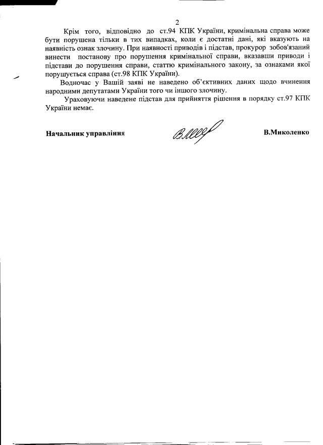 І якщо Відповідач вважав, що моя заява не містить “достатніх ознак злочину”, “достатніх даних, які вказують на ознаки злочину”, він мав би діяти відповідно до п.2 ст.97, але він цього не зробив.