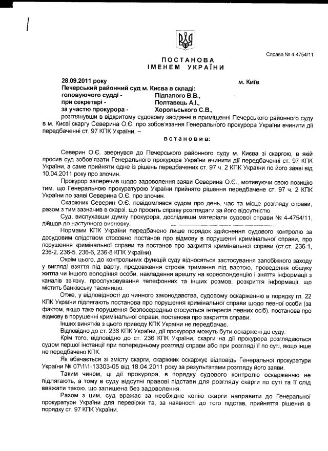 10.08.11 Печерський районний суд м.Києва своєю залишив без задоволення мої відповідні позовні вимоги до Генерального прокурора. Зазначену постанову (далі – “Постанова”) я вважаю протиправною з наступних підстав: