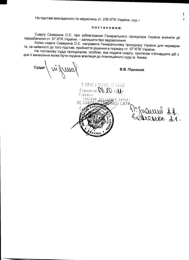 Трохи позволікавши (ну як же ж – Тимошенко, Луценко, стільки важливого) Печерський суд постановою від 10.08.11 залишив позовну заяву без задоволення з просто феєричною мотивацією: “заява…не є заявою про вчинення злочину, оскільки не містить даних про наявність в діях певних осіб ознак втручання у діяльність державного діяча чи перешкоджання діяльности народного депутата, а тому не підлягала вирішенню в порядку ст.97 КПК України…Можливі порушення самі по собі не можуть вважатись даними, які вказують на ознаки злочинів”. Для гурманів постанова в повному обсязі – тут http://www.reyestr.court.gov.ua/Review/17636379, а для тих, хто не зрозумів, у чому засаднича феєричність судової постанови – апеляційна скарга.