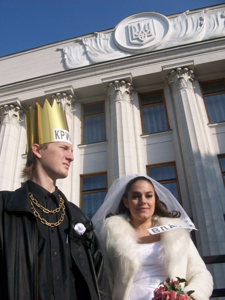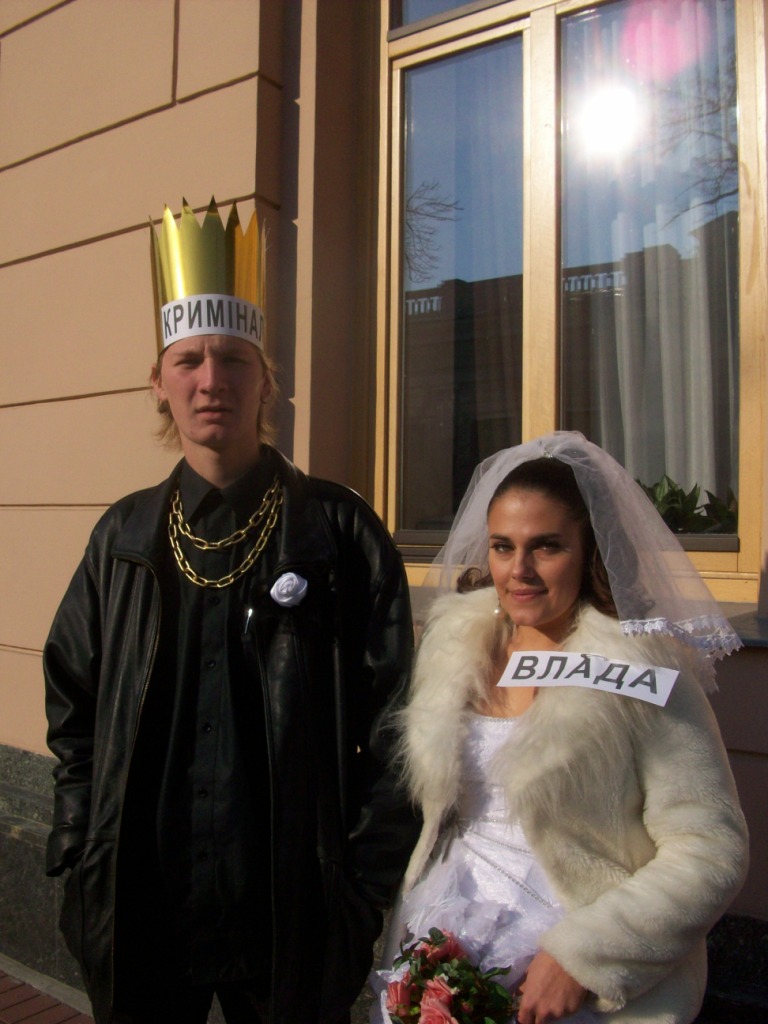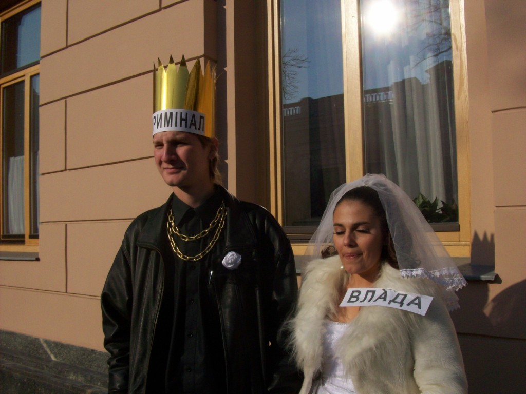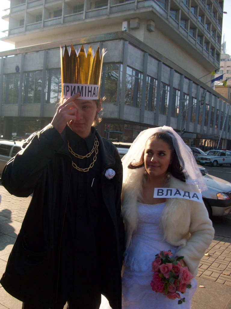 В тому числі 20 автомобілів взяло участь в автопробігу центром Києва та у піших ходіннях – близько півсотні протестувальників. Артисти-аматори створили образи Влади та Криміналу, які вирішили “оформити стосунки після 20ти років громадянського шлюбу”. Персонажі виявляли нечувану щедрість, пригощаючи перехожих сухарями, які дивно виглядали на тлі золотої оздоби “молодих”.