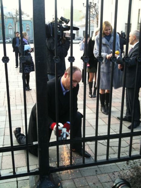 Нардеп Андрій Парубій зносить злощасний паркан навколо Верховної Ради. Фото