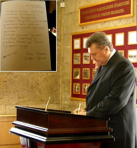 Тепер проффесор Янукович посів нову посаду – Прездента України. Саме так зазначено у записі в книзі почесних гостей у мавзолеї Кемаля Ататюрка під час візиту до Туреччини. Окрім того, як вже повідомлялося в ЗМІ, прес-служба глави держави, яка зробила цей запис замість В. Януковича, залишивши йому лише право підпису, поплутала дати, написавши 22 листопада замість 22 грудня.
