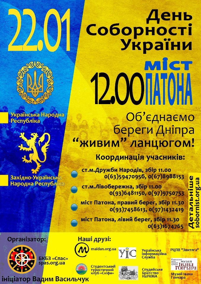 22 січня 2011 року вийти з державною атрибутикою (синьо-жовті прапори, прапорці, стрічки, боді-арт на обличчі) на вулиці своїх міст, містечок, сіл, взятись за руки і утворити символічні ланцюги єдності.