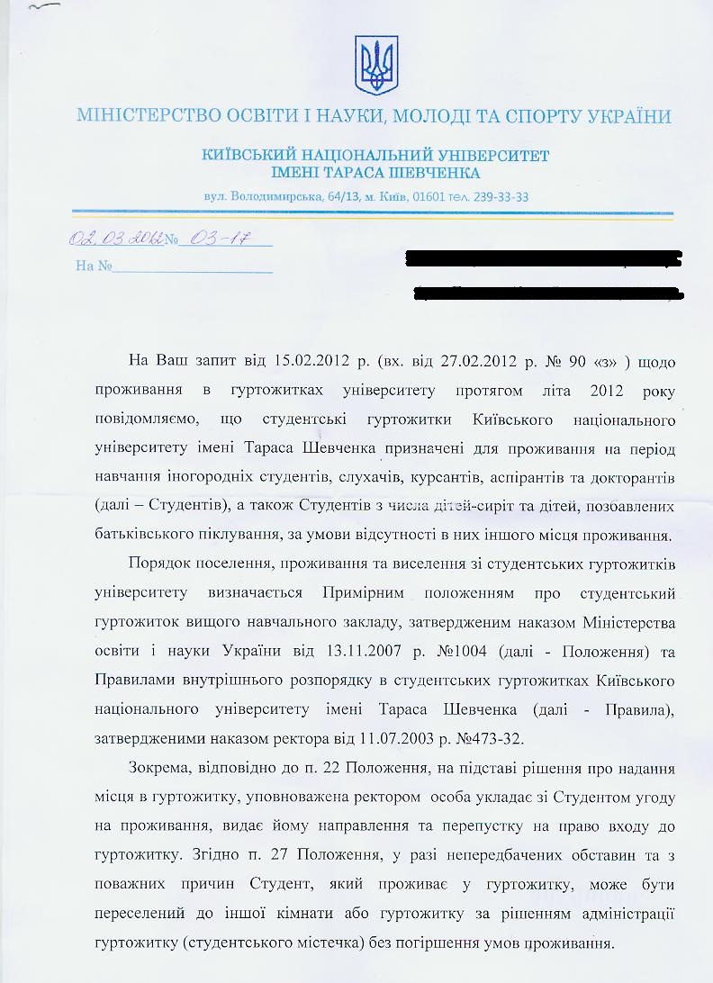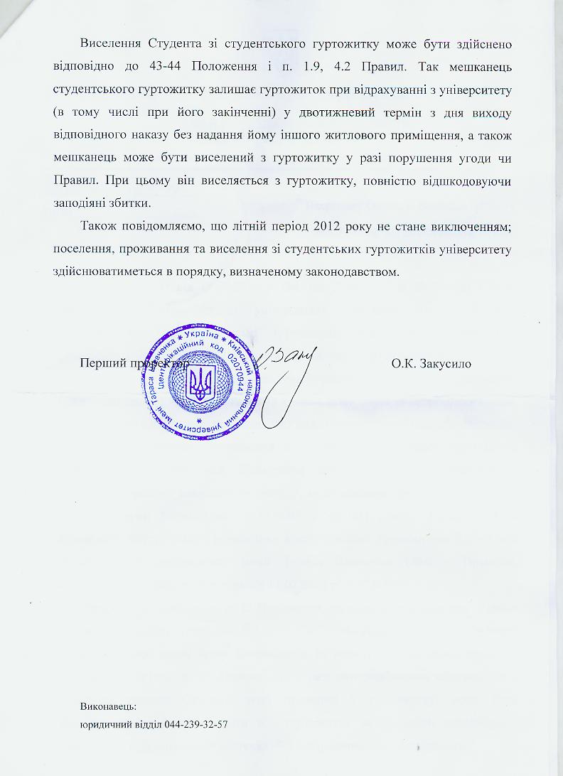 Таким чином, жодних законодавчих підстав для виселення студентів із гуртожитків на літо, на час проведення чемпіонату Євро-2012, немає! Тому ми сподіваємось на законослухняність адміністрації КНУ імені Тараса Шевченка, що вона не порушуватиме надану у офіційному листі відповідь про фактичну незаконність можливого виселення.