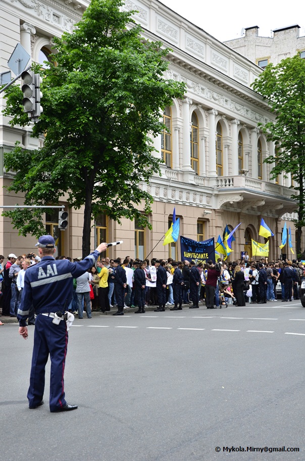 Учасники акції хотіли зареєструвати заяву для Президента, проте міліція і особи в цівільному завадили їм це зробити. Вони силою виштовхнули активістів від вхідних дверей, били, внаслідок чого, за словами учасника акції Дмитра Карпія, зараз сильно забита рука Катерини ЧЕПУРИ. Охорона неохоче показувала свої посвідчення, а деякі представники взагалі відмовлялась виконувати свій обов’зок. Особи в цівільному забороняли відео зйомку активістів. Свій спротив міліція аргументувала тим, що організатори акції за 10 днів до мітингу не попередили про це органи влади. Такі твердження міліції викликали подив в організаторів акції, адже представники міліції не знають порядок організції мітингів і з якою метою подається організаторами мирних зібрань заявка. Самі ж ініціатори акції протесту запевнили, що заявку в КМДА надіслали і закликали охорону зателефонувати в Київську міську державну адміністрацію.