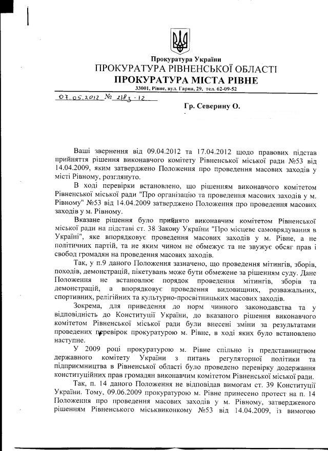 Як бачимо, рівненські прокурори не побачили чи не захотіли побачити найважливішого – відповідно до ст.39 та 92 Конституції України, ст.38 Закону України “Про місцеве самоврядування” питання організації і проведення мирних зібрань можуть регулюватися лише законами, а не підзаконними актами, зокрема – не актами органів місцевого самоврядування. Тому це питання надалі ставитиметься перед Генеральною прокуратурою. І не тільки: далі – буде.