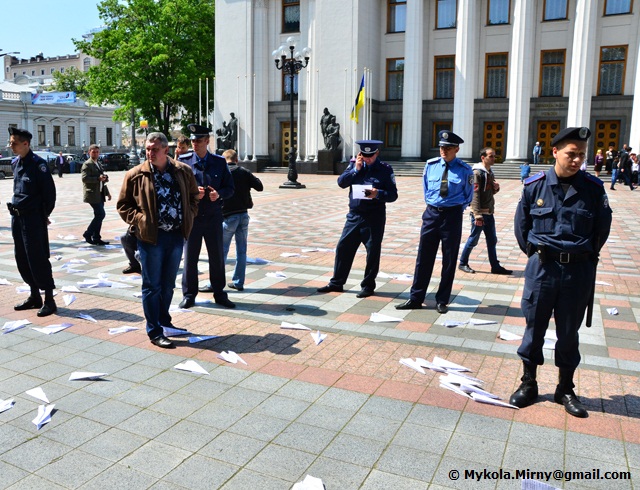Студенти, опозиційні депутати, митці що вишукувавшись вздовж паркану Верховної ради, дули в свистки і запускали через паркан зроблені з виборчих бюлетенів літачки.