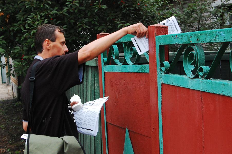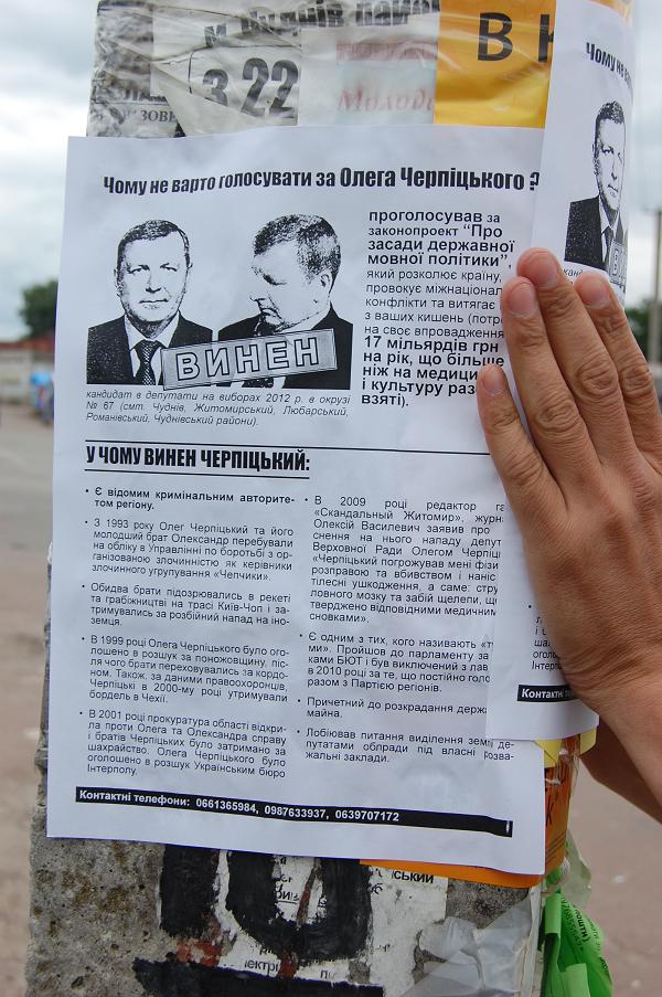 Активісти суцільно заклеїли листівками “Чому не варто голосувати за Олега Черпіцького” центр округу – селище Чуднів, а також сусіднє село Вільшанку, де знаходиться залізнична станція Чуднів-Волинський Козятинської дирекції залізничних перевезень. Також листівки (їх було понад 5 тис.) отримали практично всі мешканці цих населених пунктів.