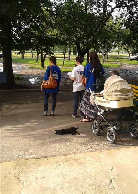 Молоді дівчата, вдягнені от в такі футболки, обходять двори з бланками заяв, і віршиком «а кому чим допомогти, а у кого які проблеми». Стверджують – «Разом переможемо»