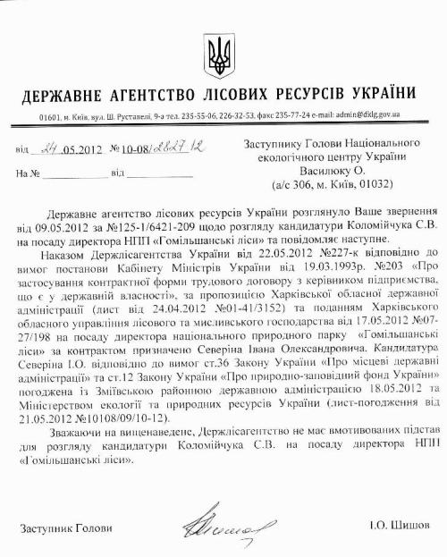 В той же час, заступник Голови Держлісагентства І.Шишов листом № 10-08/28-27/12 від 24.05.12 (його копія додається) повідомив, що Наказом Держлісагентства України № 227-к від 22.05.12, за пропозицією Харківської обласної державної адміністрації (лист від 24.04.12 №01-41/3152) та поданням Харківського обласного управління лісового та мисливського господарства від 17.05.12 №07-27/198 на посаду директора національного природного парку «Гомільшанські ліси» призначено І.Северіна.