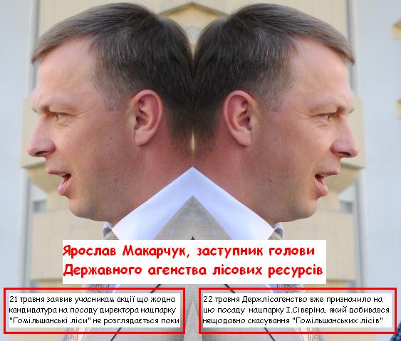 Таким чином, 21.05.12 Я.І.Макарчук щодо призначення І.Северіна на посаду директора національного природного парку «Гомільшанські ліси» публічно надав неправдиву інформацію. Збрехав. Згідно ст. 16 Закону України “Про засади запобігання і протидії корупції”, керівникам центральних органів виконавчої влади забороняється “надавати несвоєчасно, недостовірну чи не в повному обсязі інформацію, яка підлягає наданню відповідно до закону”.