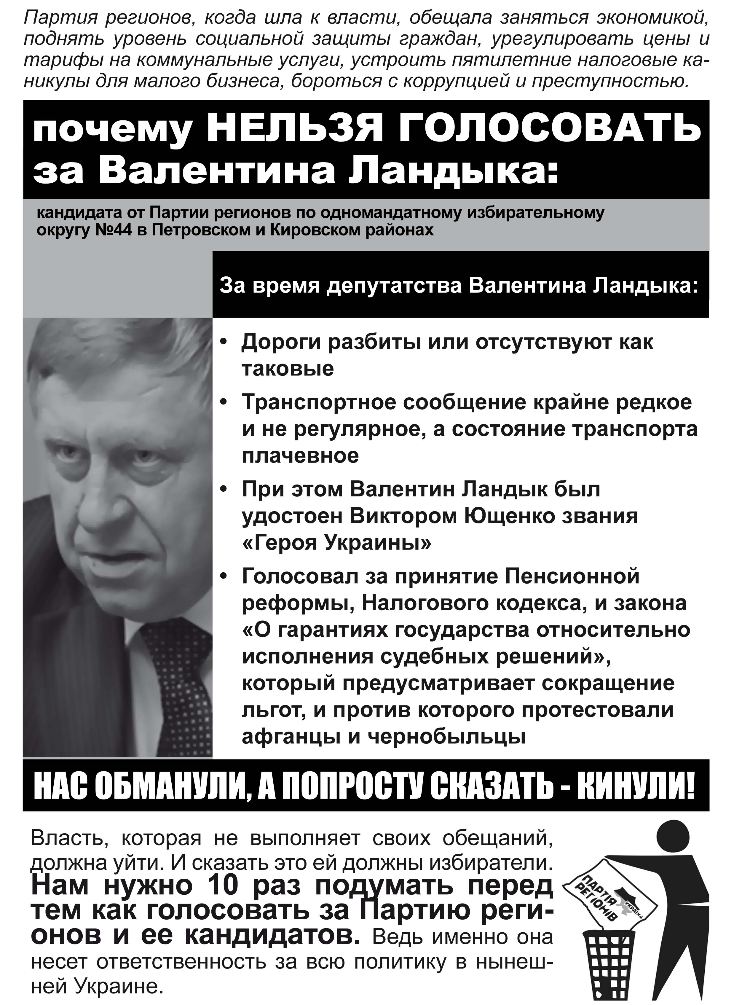 Участники кампании “Месть за раскол страны” повторно распространили в городе листовки на русском языке, в которых не упоминаются языки, а приводятся нелицеприятные факты невыполнения Партией регионов своих предвыборных обещаний и факты коррупционных действий кандидатов, баллотирующихся в парламент от этой политической силы.