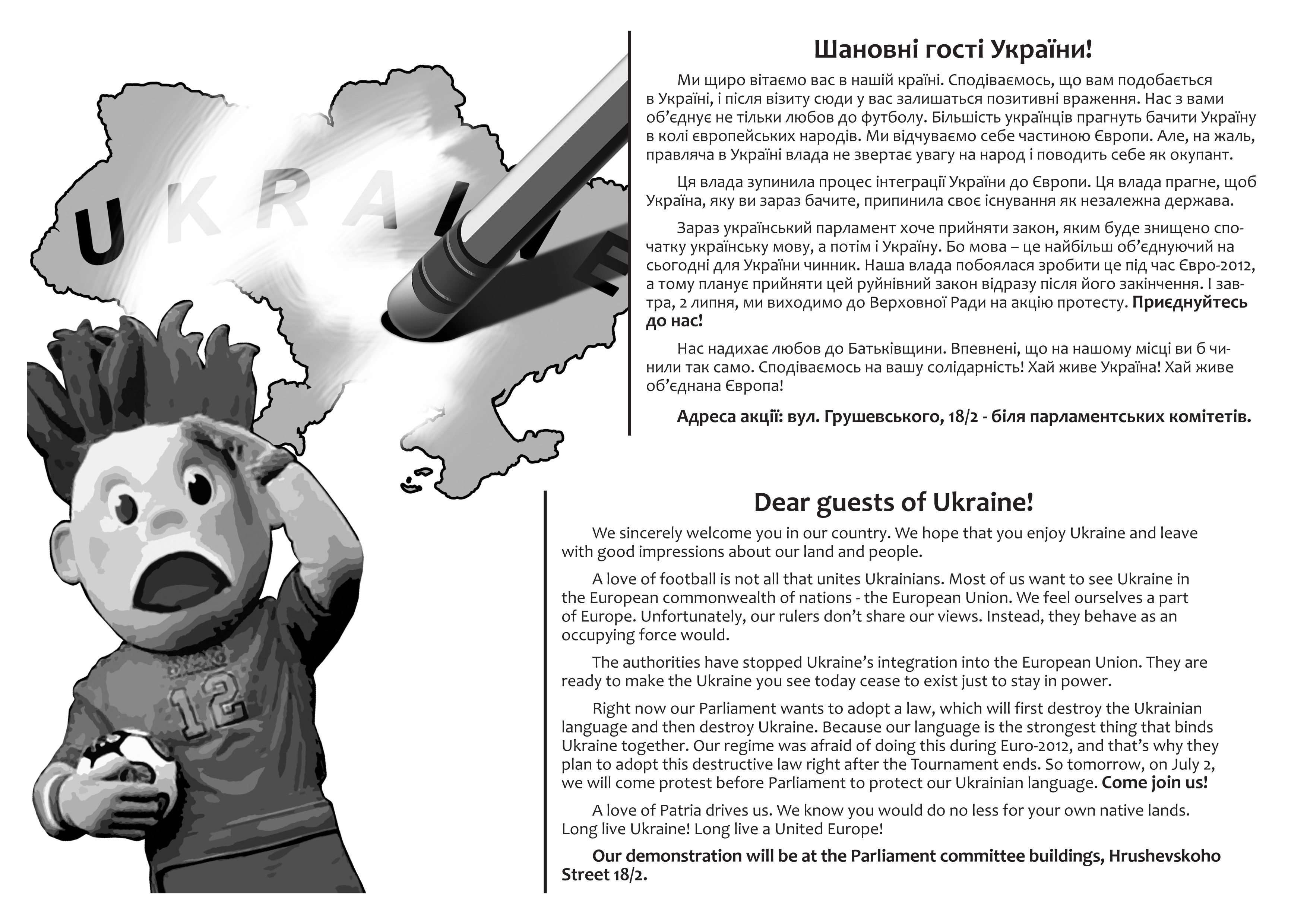 Вчора активісти Громадянського руху “Відсіч” проінформували іноземців, які приїхали до Києва на фінал чемпіонату Євро 2012, про заплановані по всій Україні акції протесту проти розкольницького законопроекту Ківалова-Колесніченка “Про засади державної мовної політики”. Гості столиці дізналися, що в той час, коли в Україні проходить маштабний європейський футбольний захід, українська влада має намір зупинити євроінтеграційні процеси в нашій державі, шляхом прийняття вибухонебезпечного мовного законопроекту, який загрожує розколоти країну і навіть може призвести до громадянської війни на кордонах Європейського Союзу.
