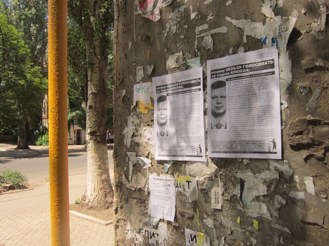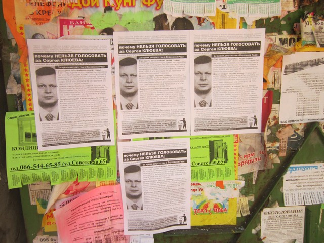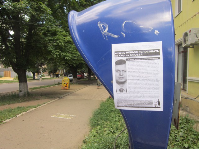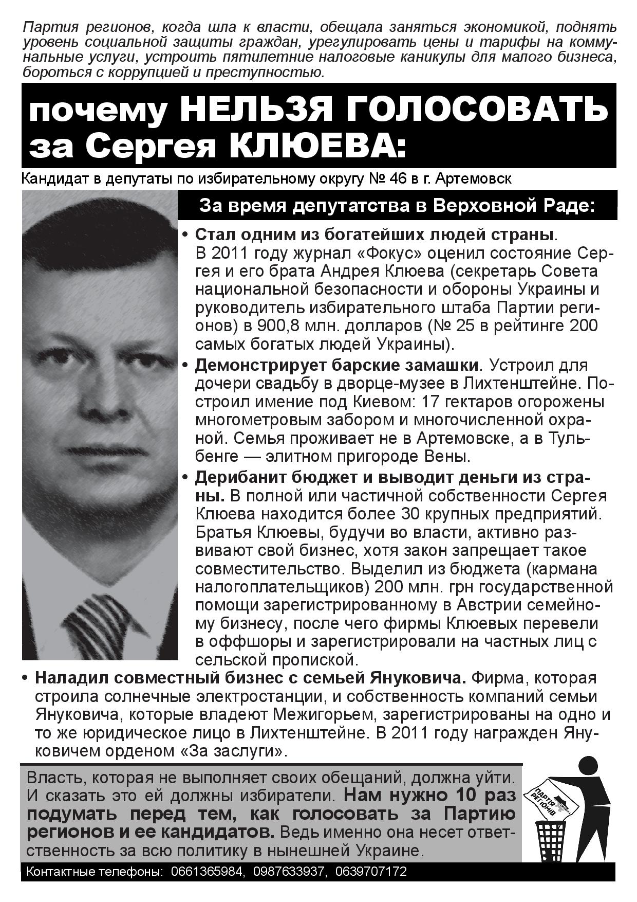 Мешканців міста Артемівська Донецької області активісти кампанії “Помста за розкол країни” закликали не голосувати за Сергія Клюєва, брата одного з головних тіньових лобістів законопроекту Колесніченка-Ківалова “Про засади державної мовної політики” голови Ради нацональної безпеки і оборони України та керівника виборчого штабу Партії регіонів Андрія Клюєва.
