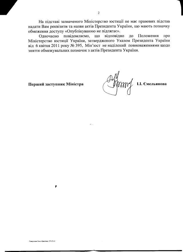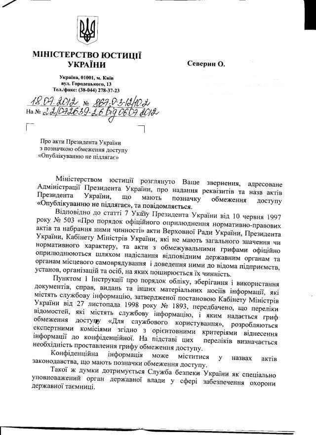 “Міністерство справедливости” повторно відмовило в наданні інформації про назви та реквізити правових актів президентів України (всіх) з незаконною (не передбаченою не те що законом, але і жодним підзаконним актом) позначкою обмеження доступу “опублікуванню не підлягає”. Таких актів, за зізнанням самого МЮ, наразі є вж 137 штук.