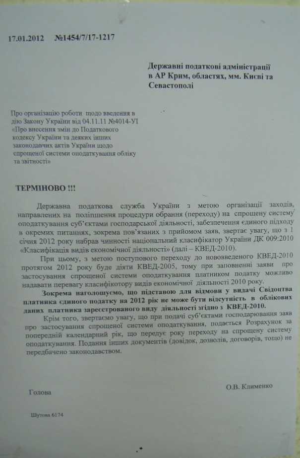 Про те, що ніякого внесення змін у КВЕДи від підприємців не вимагається, просто-таки волають великі, на аркуш А3, копії внутрішньовідомчого листа Податкової адміністрації, які розвішані по всіх стінах. У передбаннику та біля ліфта я нарахувала їх більше 5: